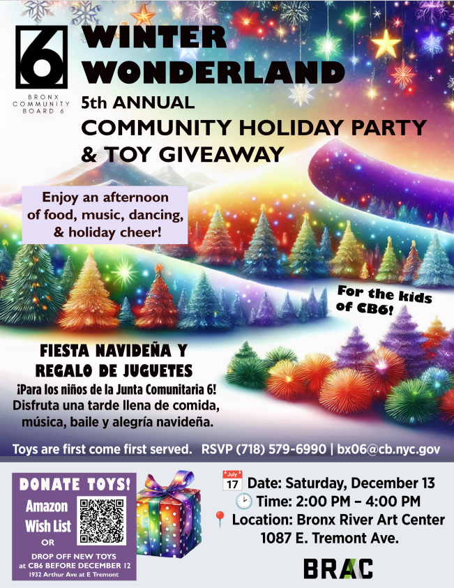 You’re invited to the 5th Annual CB6 Holiday Party & Toy Giveaway! Come for the music, food, toys, dancing, holiday cheer, and a chance to meet your neighbors — let’s celebrate the season together! ❤️